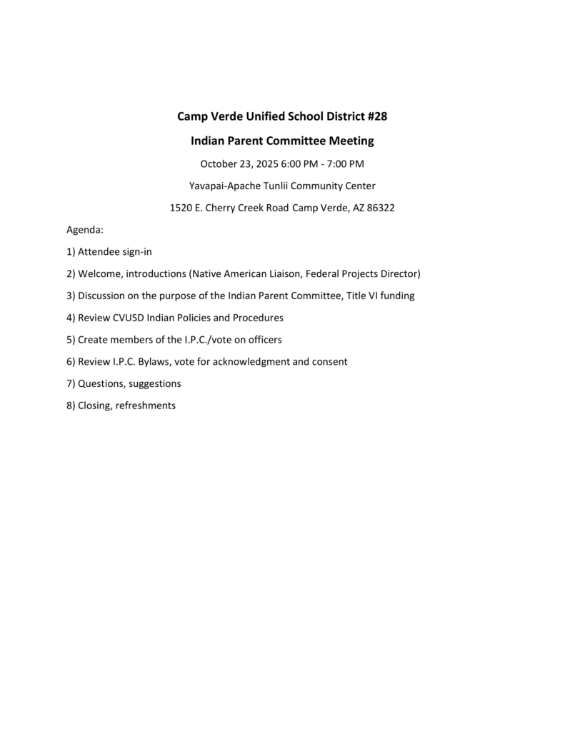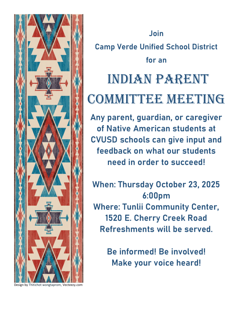 The Camp Verde Unified School District will be hosting an Indian Parent Committee meeting on Thursday October 23, 2025 at 6:00pm at the Tunlii Community Center.
