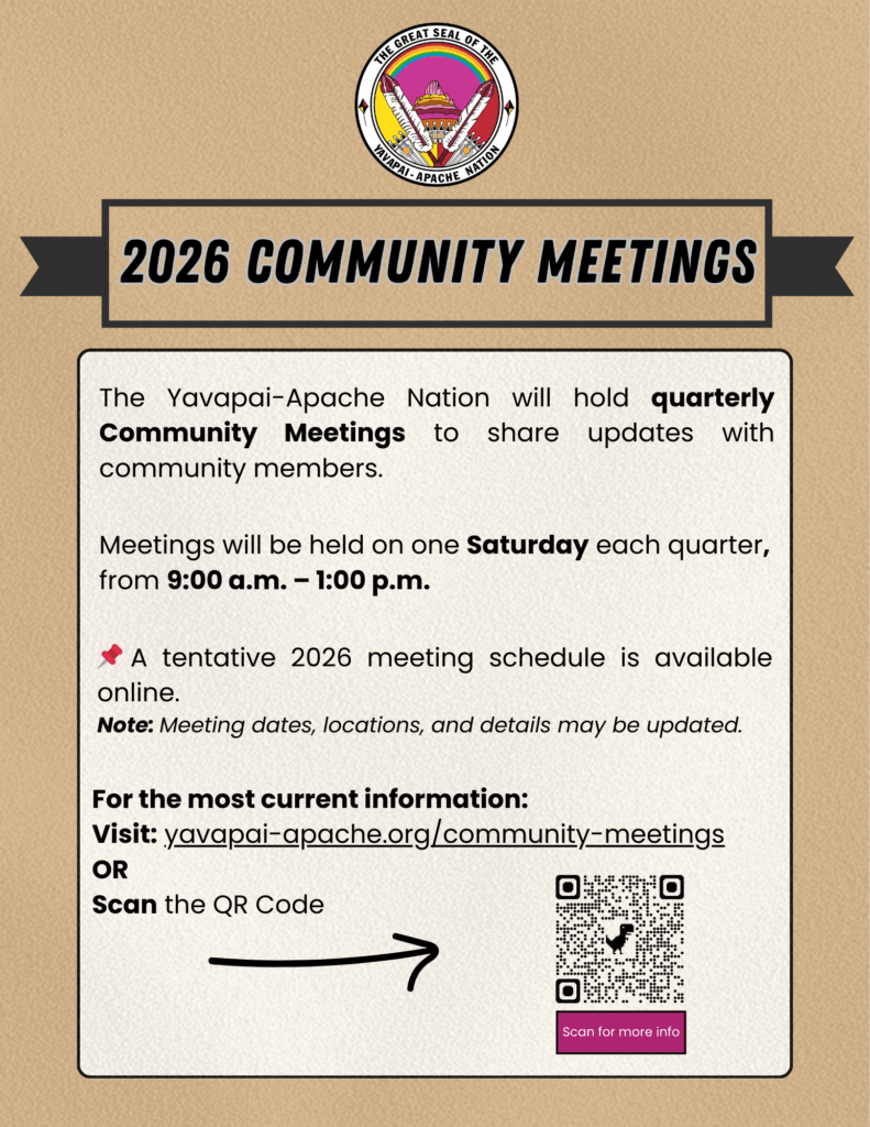 The Yavapai-Apache Nation has released information for its 2026 Community Meetings, which will be held quarterly to share updates and information with community members.