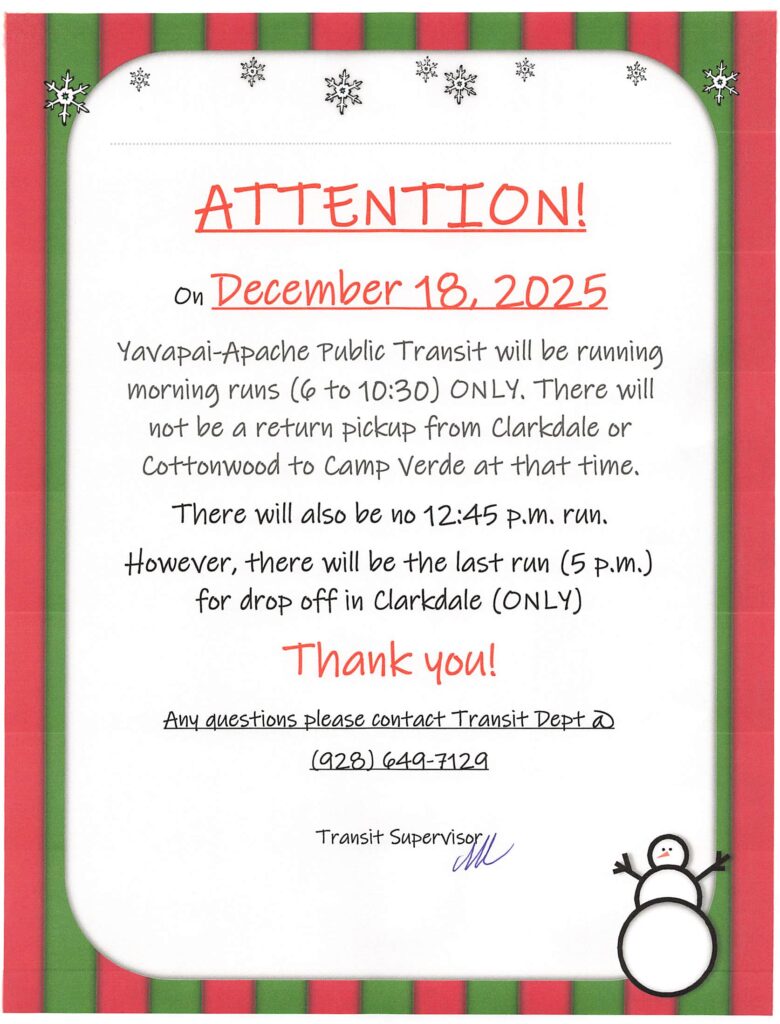 The Yavapai-Apache Nation Public Transit Department is providing an updated service notice for Thursday, December 18, 2025.