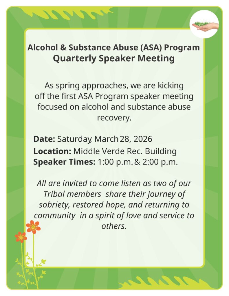 The Yavapai-Apache Nation Alcohol & Substance Abuse (ASA) Program is hosting its first Quarterly Speaker Meeting focused on alcohol and substance abuse recovery. Community members are invited to come listen as two Tribal members share their personal journeys of sobriety, restored hope, and returning to community in a spirit of love and service to others.