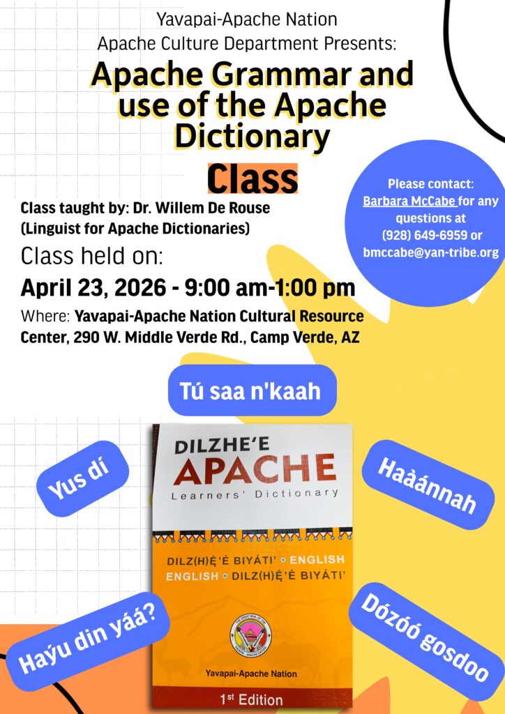 The Yavapai-Apache Nation Apache Culture Department invites community members to attend an Apache Grammar and Use of the Apache Dictionary Class.