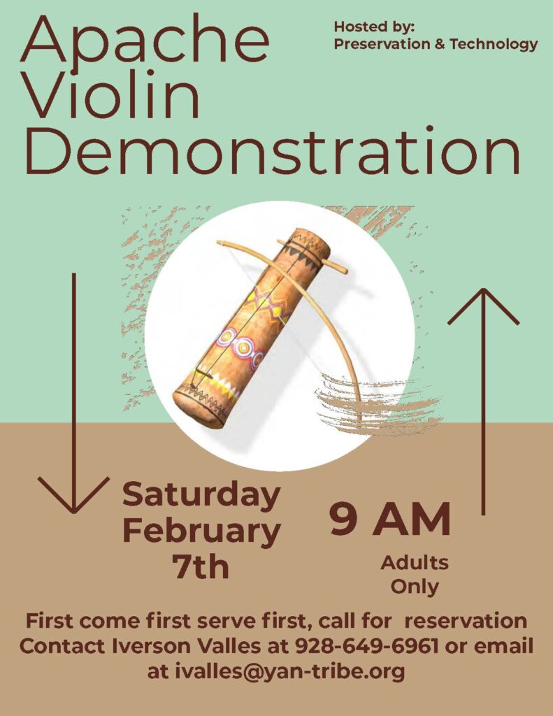 The Yavapai-Apache Nation Preservation & Technology invites YAN community members to attend an Apache Violin Demonstration on Saturday, February 7, beginning at 9:00 a.m.