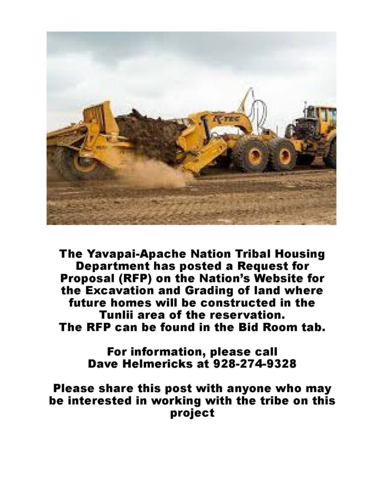 The Yavapai–Apache Nation Tribal Housing Department has released a Request for Proposal (RFP) for Excavation and Grading Services for the Limited Partnership #10 and Helping Hands housing projects.
