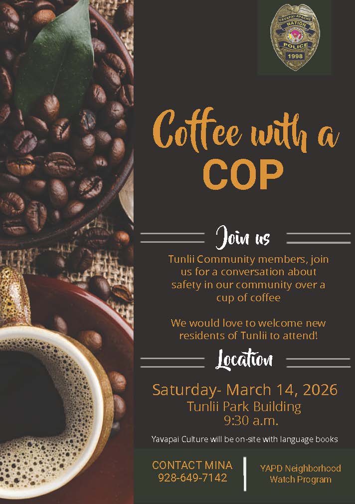 The Yavapai-Apache Police Department invites Tunlii Community members to attend Coffee with a Cop — an opportunity to engage in open conversation regarding community safety and public concerns.