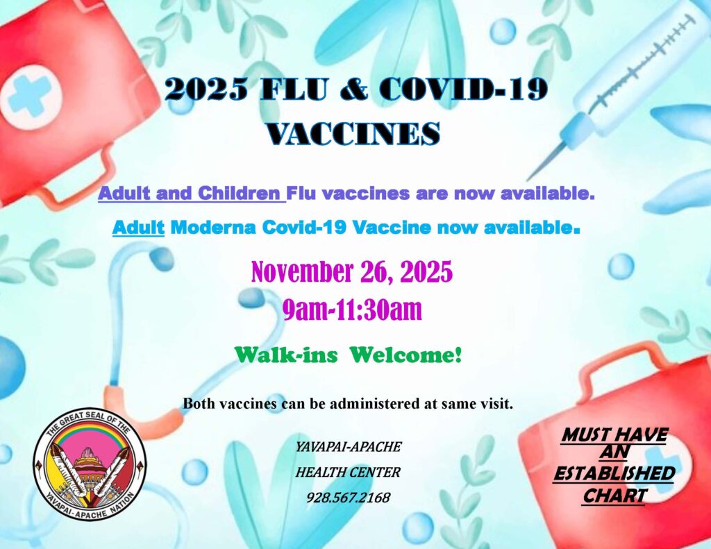 The Yavapai-Apache Health Center will be offering Adult & Children Flu vaccines and the Adult Moderna COVID-19 vaccine.