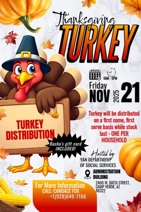 The Yavapai-Apache Nation Department of Social Services invites all Tribal households to the annual Thanksgiving Turkey Distribution on Friday, November 21, 2025, from 6:00 a.m. to 5:00 p.m. at the Administration Building in Middle Verde.