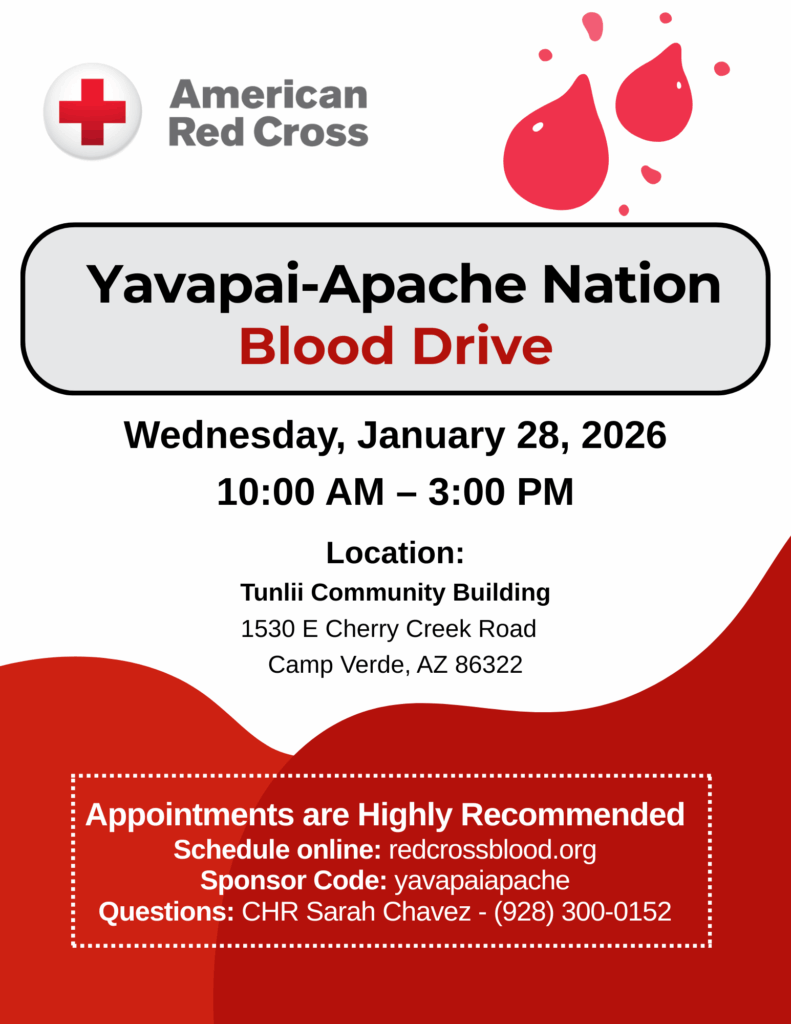 The Yavapai-Apache Nation, in partnership with the American Red Cross, will be hosting a community blood drive.