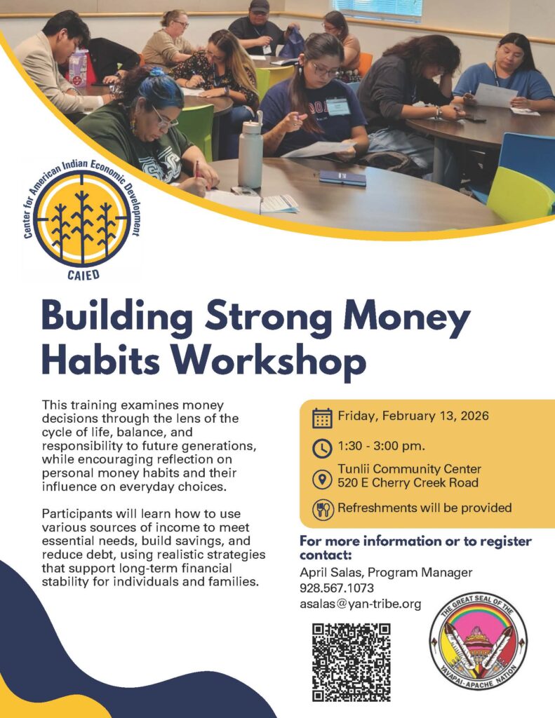 The Yavapai-Apache Nation invites our community members to attend a Financial Literacy Workshop hosted by the WIOA Program and presented by the Center for American Indian Economic Development (CAIED).