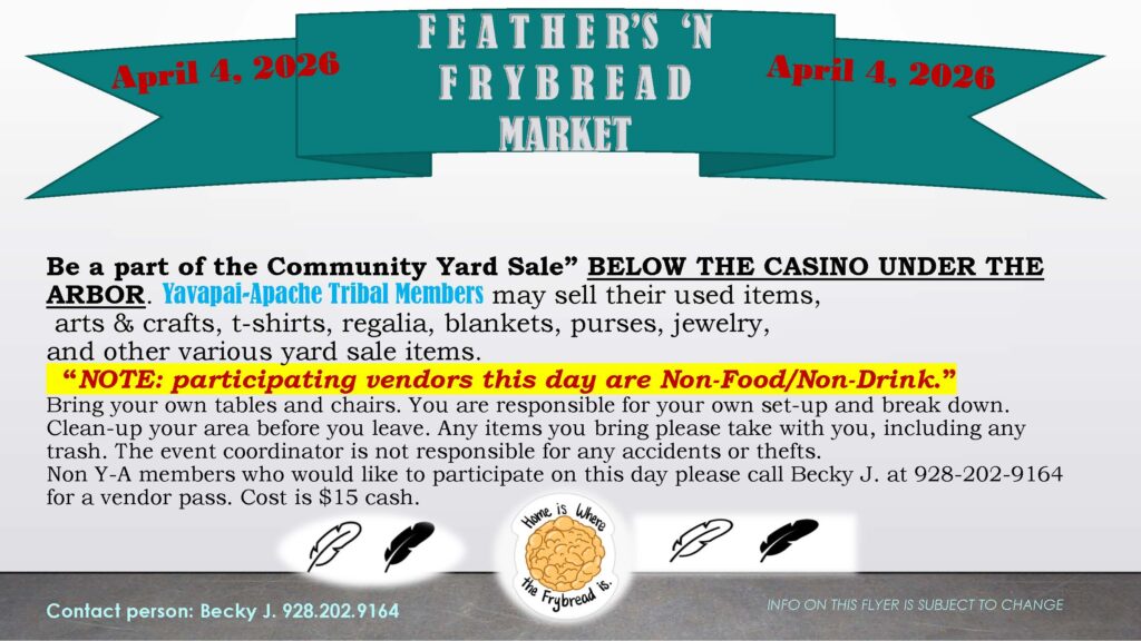 Yavapai-Apache Tribal Members are invited to participate in the community yard sale and sell used items, arts & crafts, T-shirts, regalia, blankets, purses, jewelry, and other yard sale items.