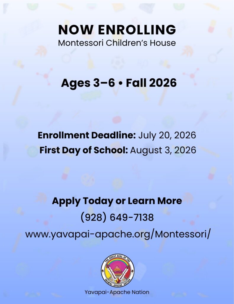 The Yavapai-Apache Nation Montessori Children’s House is now enrolling students ages 3–6 for the Fall 2026 school year.