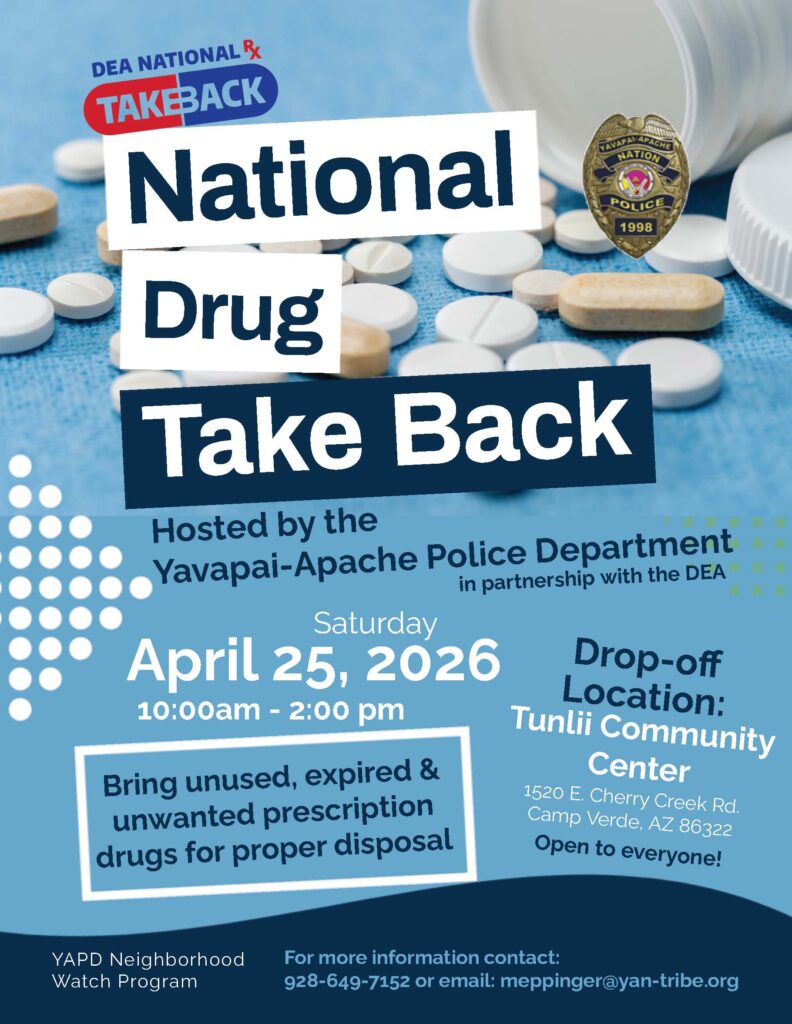The Yavapai-Apache Police Department, in partnership with the DEA, will host a Drug Take Back event for the community.