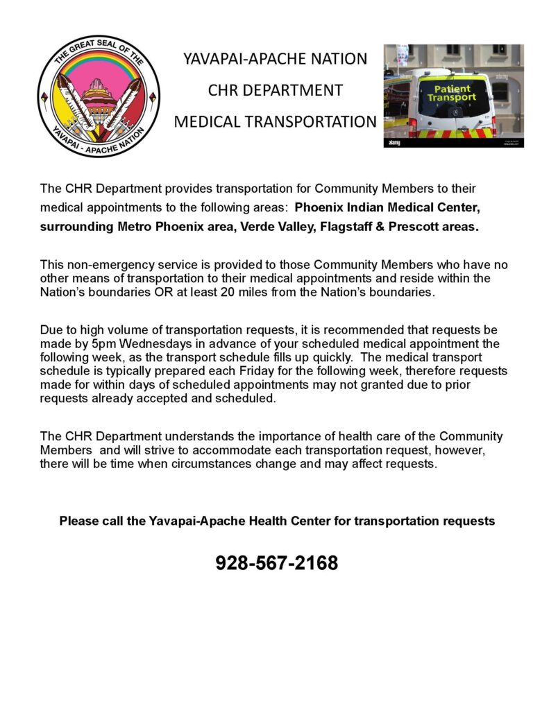 For medical transportation requests, please call the Yavapai-Apache Health Center at 928-567-2168.