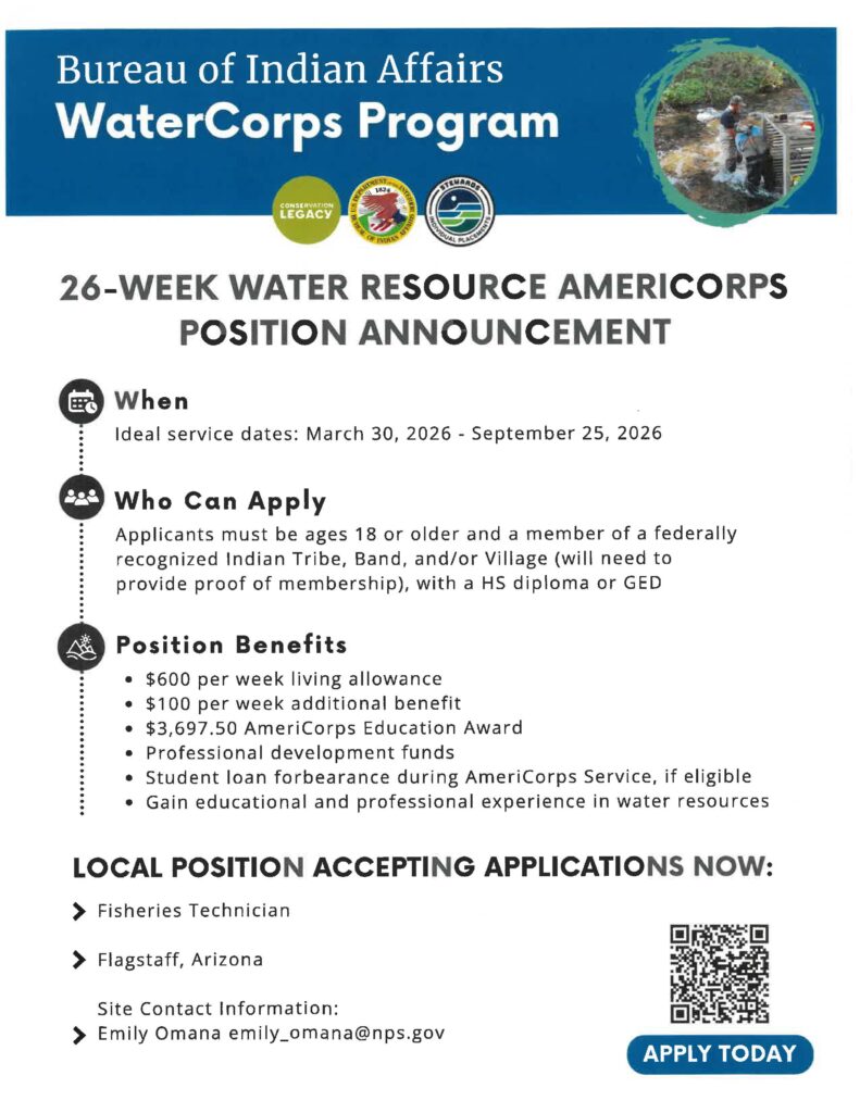The Bureau of Indian Affairs (BIA) WaterCorps Program is accepting applications for a 26-week Water Resource AmeriCorps position, with a local placement available as a Fisheries Technician in Flagstaff, Arizona.