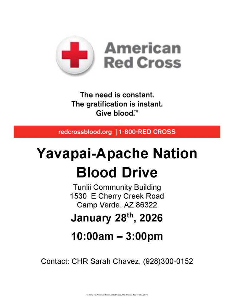 The Yavapai-Apache Nation, in partnership with the American Red Cross, invites community members to participate in an upcoming blood drive.
