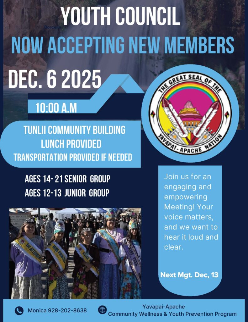 The Yavapai-Apache Nation youth are invited to attend the next Youth Council Meeting. New members are welcome and encouraged to join the meeting and participate with other youth.